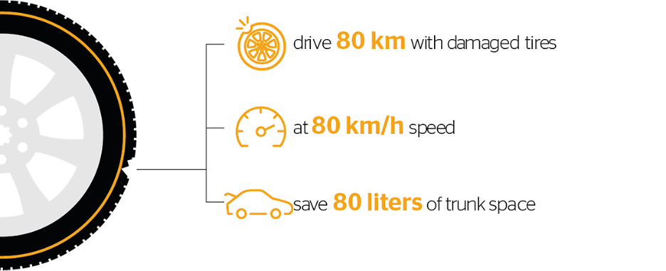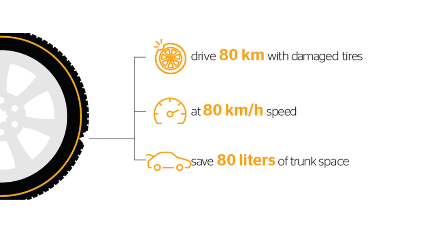 SSR's technology is quite wonderful. After a puncture, the weight of the car is supported by the reinforced sidewall of the tire, enabling you to travel up to 80 km at 80 km/h.